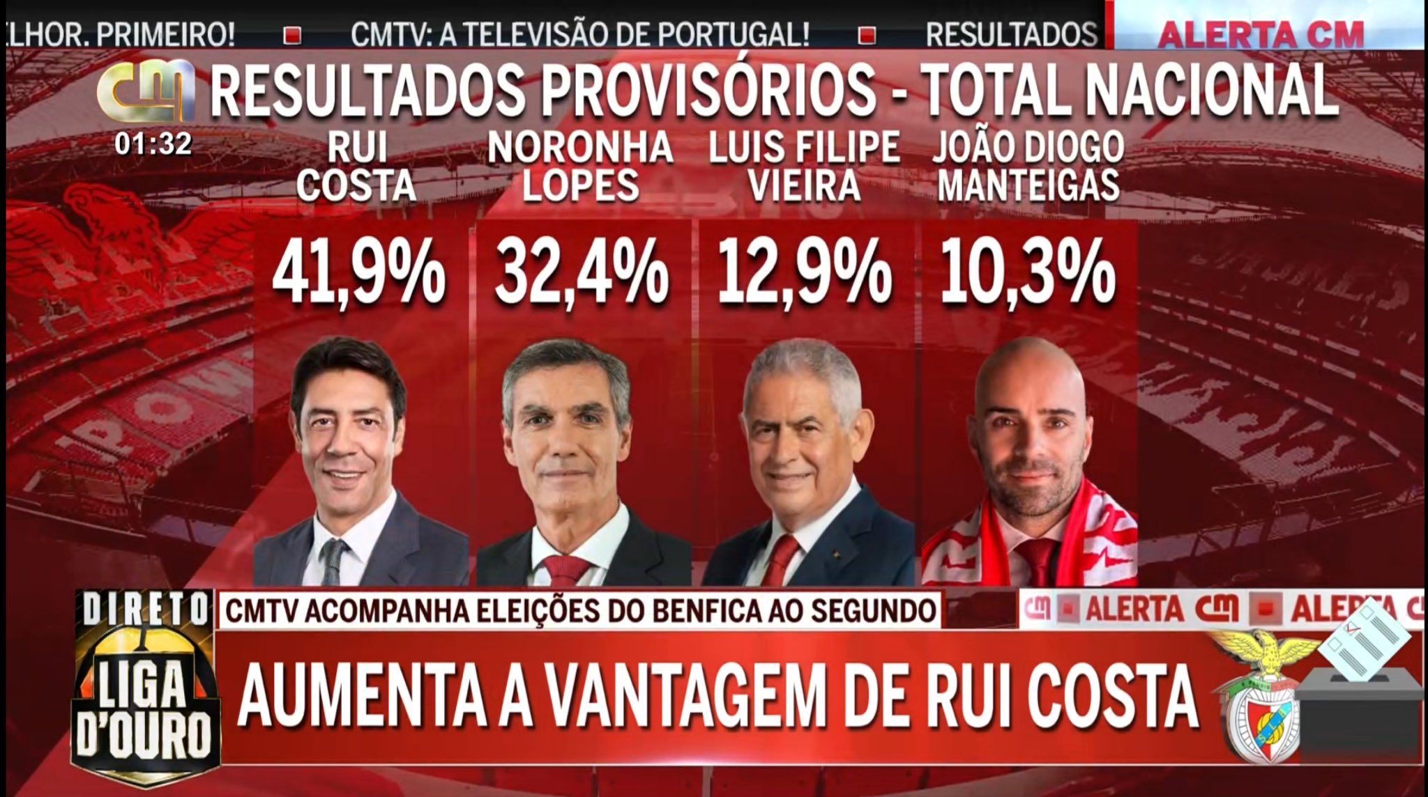 Ainda vais ver o Ruie a ganhar à 1ªO rui costa cada vez mais vai aumentar a vantagem, e o vieira aumenta a vantagem do burro (manteiga em italiano), os votos na segunda volta vao para o vieira e xau noronha. OS gajos do movimento ser benfica nao aceitam e vao fazer a vida negra ao rui costa chumbando 2 orçamentos e temos eleiçoes de novo , isso vai criar um odio ainda maior aos apoiantes de rui costa e temos um benfica completamente polarizado. Tudo o que os rivais querem . Welcome to vietnammmmm