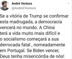 Isto entronca perfeitamente numa discussão que tivemos ontem sobre protecionismo e liberalismo... Claro que o ventura apoiava o trump. Agora é que não lhe dá jeito em virtude das coisas ridiculas que temos vindo a assistir!!Eu penso que haverão dois Andrés, até porque o André que escreve no Twitter, pela declaração abaixo apoia(va) o Trump.