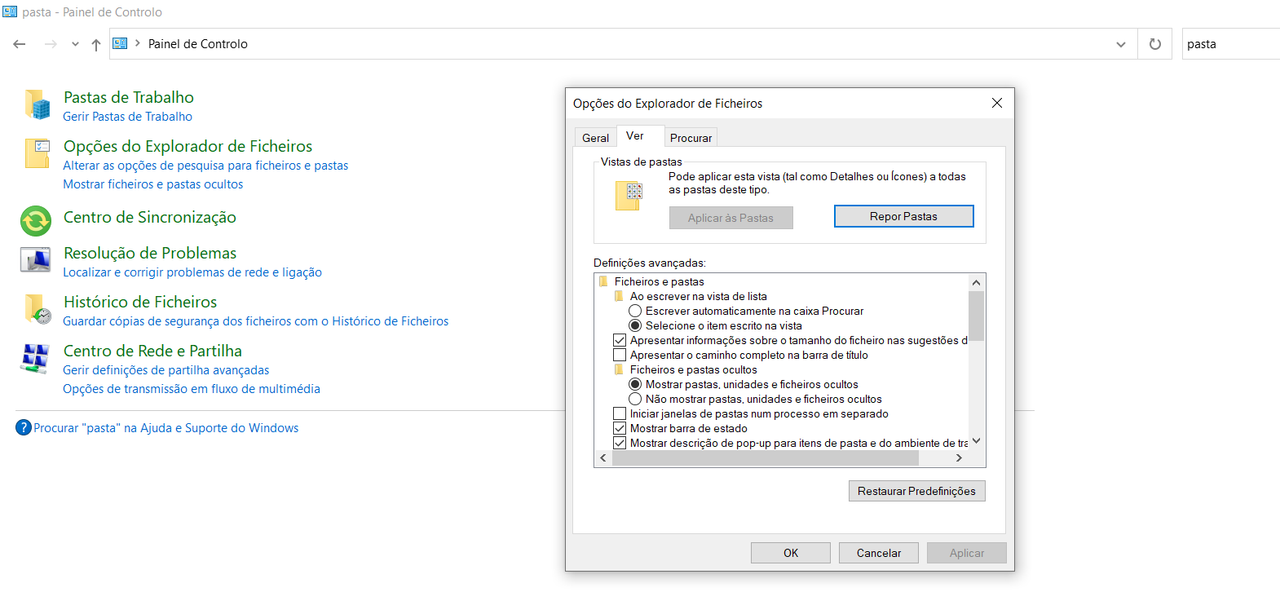 Se fores ao painel de controlo e pesquisares pasta, vai te aparecer uma opção para mostrar ficheiros e pastas ocultos. Clicas aí em cima e depois tens que accionar o que diz "Mostrar pastas, unidades e ficheiros ocultos".