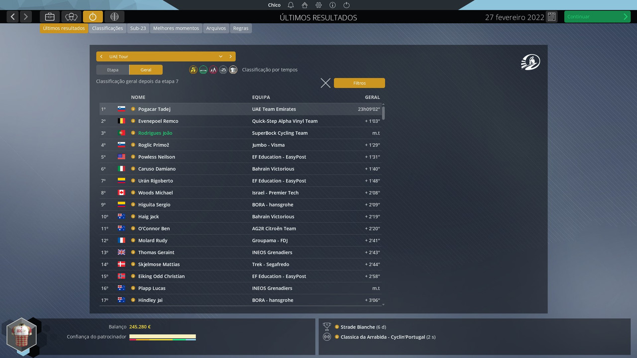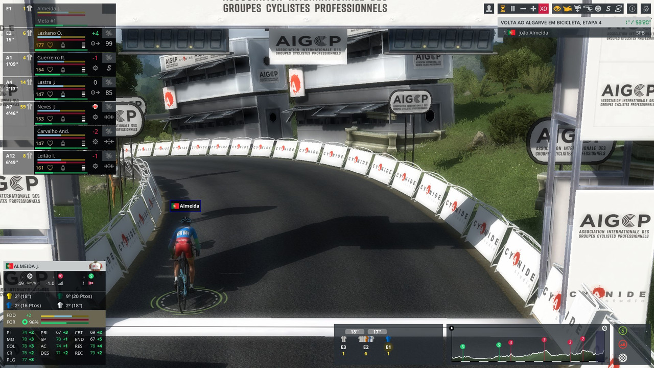 No Algarve, perdi tempo na Foia para o Sivakov devido a mau posicionamento (Almeida's special) pois ia na roda do Yates, para quem julgava a INEOS estar a trabalhar e o Sivakov do nada atacou e eu estava longe para seguir. Acabei por fazer segundo nessa etapa a 17 segundos do Pavel. No Malhão a história já foi outra pois consegui manter a subida toda a um grande ritmo com o João a ir sozinho no final para ganhar cerca de 20 segundos mais bonificações, o que aliado ao CR, que fiquei em 5º acima de todos os outros corredores da geral, permitiu-me vencer a Algarvia. Nota que a Starting List não era nada por aí além devido às datas (os dois ET's foram à UAE Tour).