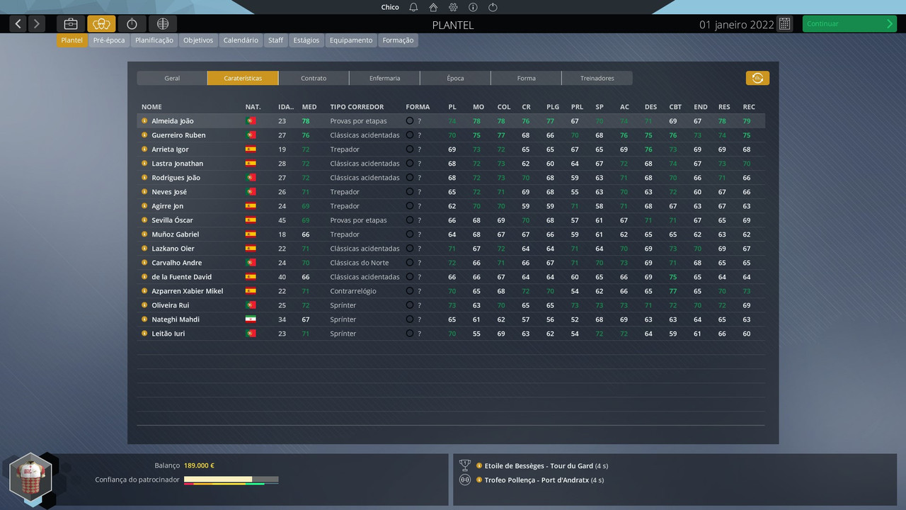 Com o azar do João neste Giro e com algumas das coisas que fui lendo neste tópico deu-me vontade de criar uma Pro-Conti Portuguesa/Espanhola centrada no João e com o objetivo de desenvolver ciclistas ibéricos (Só vou contratar ciclistas destes dois países e irei sempre dar preferência a jovens). Irei também jogar em dificuldade difícil no inicio e depois se achar que esta irrealista irei mudar para extrema.