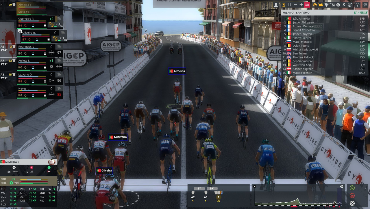 Acabei de ganhar a Sanremo com o João Almeida, parti a corrida na Cipressa e num grupo com 20 e poucos corredores tinha 4(Almeida, Guerreiro, Rodrigues e Rui Oliveira) para o Poggio, entrei a matar e ataquei com o João (o plano era levá-lo a meta e ser lançado pelo Rui Oliveira) visto que Van Aert e assim estavam mal posicionados. Quase que morria na praia mas felizmente consegui a vitória.