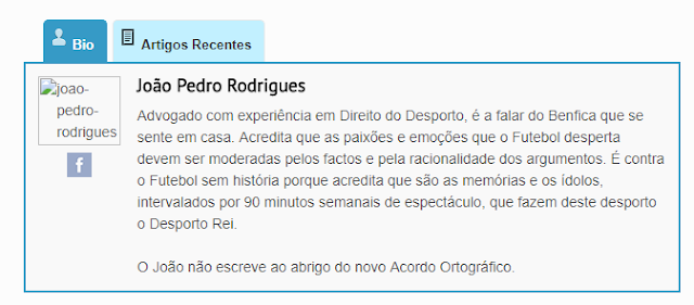 É engraçado que João Moura e João Pedro Rodrigues tenham tantas semelhanças. Para além do nome, ambos trabalham para a Abreu Advogado, escreveram no Record e frequentaram juntos a pós-graduação da Liga. Mas há mais: Quer um, quer outro gostam de se esconder. Um tem “vergonha” de ficar da fotografia de família dos delegados da Liga como já vimos (aqui) e o outro tem “vergonha” do seu passado como cronista.